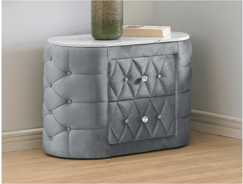 Add a touch of opulence to your space with this exquisitely designed bedside piece, blending contemporary elegance with timeless sophistication. The sleek silhouette is wrapped in a luxurious, tufted finish, complete with shimmering accents that catch the light beautifully. Its spacious drawers, adorned with chic, crystal-inspired hardware, offer both style and practicality, making it the perfect solution for keeping your essentials within reach. Topped with a smooth, faux marble surface, it provides the ideal space for decorative elements or everyday necessities. Elevate your bedroom decor with this statement piece that embodies both functionality and refined glamour. 5115GY-2 NATALIA NIGHT STAND GREY