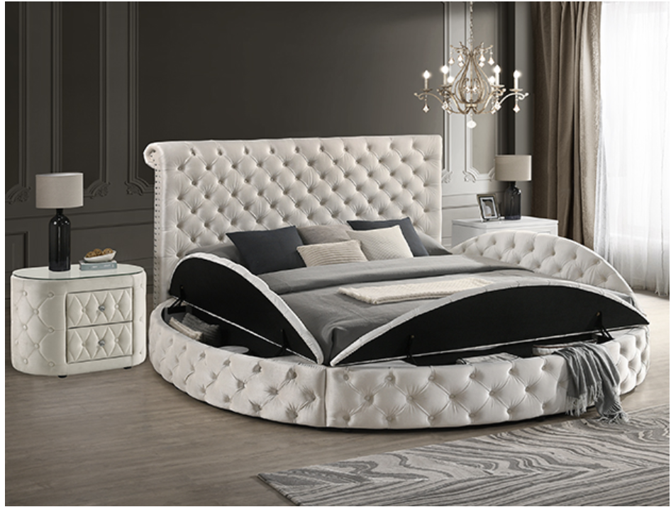 This avant-garde bed is a luxurious retreat, blending opulence with innovative design. Its unique round form challenges traditional bedroom aesthetics, offering a lavish centerpiece that is as comfortable as it is striking. The bed is generously upholstered in a plush ivory velvet, featuring exquisite button-tufted detailing throughout, which is both visually appealing and sumptuously tactile. Glamorous accents are provided by the studded embellishments along the headboard, adding a touch of sparkle and sophistication. The bed’s innovative design includes a practical storage system, discreetly hidden to maintain its sleek profile.