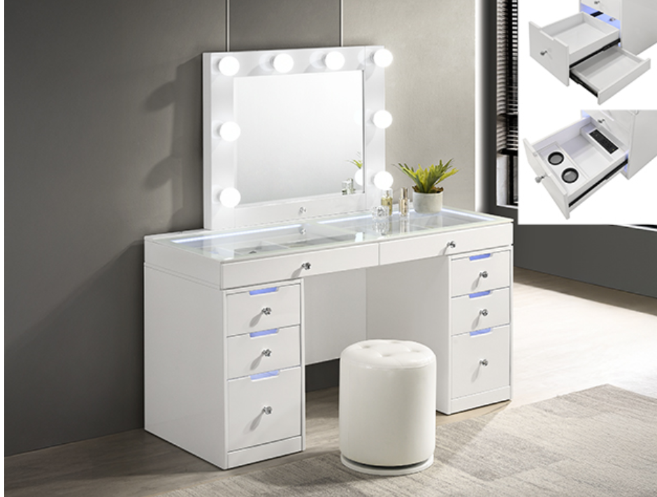 Step into a world of glamour with this sleek and chic vanity set, a perfect fusion of functionality and fashion. Its glossy white finish and clean lines are complemented by the sparkle of crystal-like knobs, adding a touch of sophistication to your personal space. The spacious tabletop, graced with a large mirror surrounded by radiant lights, offers an ideal stage for beauty routines, ensuring flawless makeup application under impeccable lighting. With a variety of drawers, this vanity provides ample storage to keep essentials organized and within reach. Interior drawer lighting, integrated outlet, and hidden drawer storage are just some of the included features. B4852WHSET LUXO VANITY