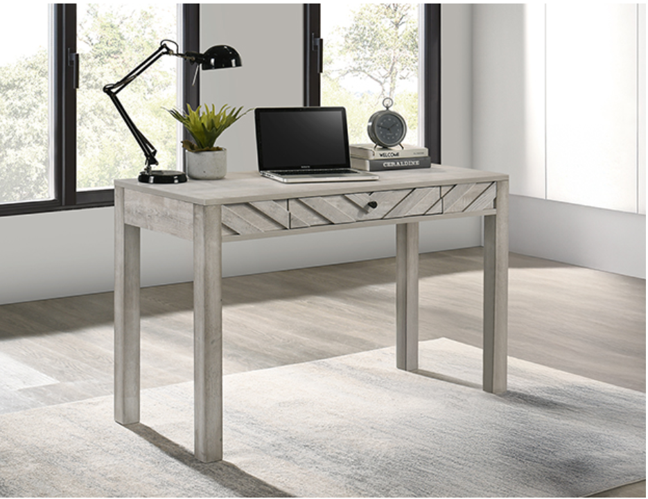 Embrace rustic charm and timeless elegance with this beautifully handcrafted workspace essential. Designed with a minimalist silhouette and a distressed white finish, this piece effortlessly blends vintage aesthetics with modern functionality. The unique chevron-patterned drawer front adds a touch of artisanal craftsmanship, while the spacious surface provides the perfect setting for work, study, or creativity. Sturdy and durable, it is built to complement both farmhouse and contemporary interiors, making it a versatile addition to any home or office. Elevate your productivity with a design that balances warmth, character, and practicality in perfect harmony. B9330-DESK VALOR WRITING DESK