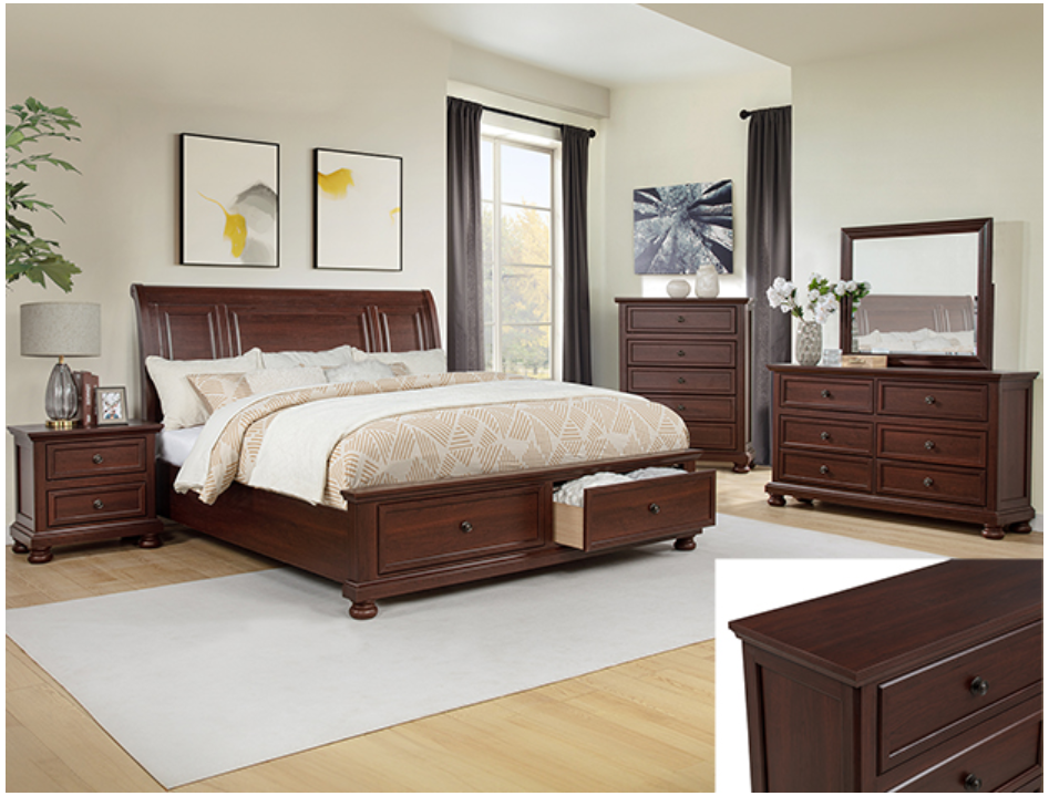 Immerse yourself in timeless elegance with this beautifully crafted bedroom collection that exudes classic charm and sophistication. The rich cherry finish brings warmth and depth to the space, complemented by exquisite detailing and elegant curves. Each piece is designed with functionality in mind, offering ample storage options, including convenient under-bed drawers, to keep your sanctuary organized and clutter-free. The luxurious design is both inviting and practical, providing a perfect balance of aesthetics and comfort. Transform your bedroom into a serene haven of style and relaxation with this cohesive and elegant suite