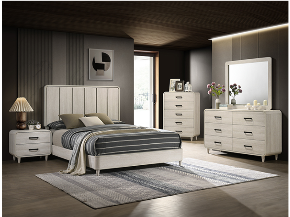 Elevate your sleeping space with this chic and contemporary bedroom collection, crafted to infuse your home with sophisticated elegance. The set features a sleek, minimalist design in a soft, neutral finish, providing a sense of calm and tranquility. The bed’s graceful paneling adds a touch of modern flair, creating an inviting focal point. Each piece is designed with functionality in mind, offering ample storage solutions with smooth, streamlined drawers and stylish hardware. Transform your room into a serene retreat with this cohesive ensemble, where timeless design meets modern luxury.