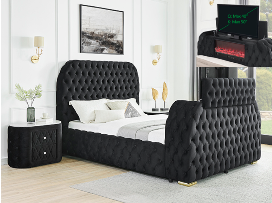 Indulge in the epitome of luxurious comfort and innovative design with this exquisite bed, a true masterpiece for those who appreciate both form and functionality in their sleeping quarters. Boasting a majestic, deeply tufted headboard that extends all the way to the edges, this bed is upholstered in sumptuous black velvet, offering a touch of opulence to any bedroom setting. The footboard features an integrated television lift mechanism, seamlessly blending entertainment with relaxation. Additionally, a built-in electric fireplace enhances the ambiance and provides a cozy, warm glow that invites you to unwind in style. The design is completed with subtle gold accents on the feet, adding a dash of elegance. This bed is perfect for those seeking a luxurious retreat that combines modern technology with sophisticated design elements to create an unparalleled bedroom experience.