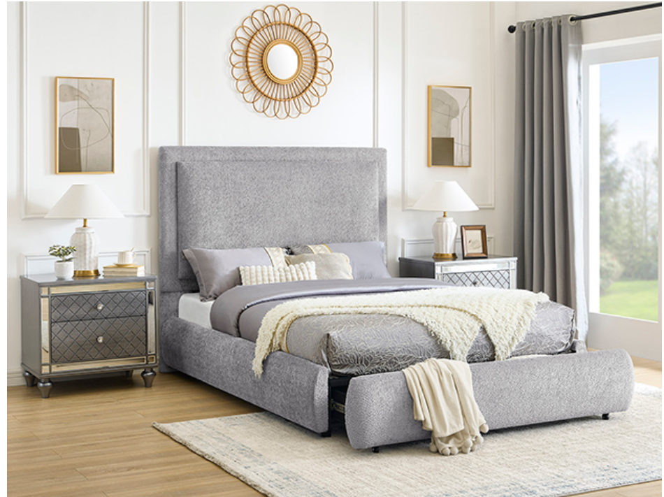 Bring a touch of refined elegance and practical design to your bedroom with this chic and luxurious bed frame. Upholstered in a soft chenille fabric with a hint of shimmer it exudes modern sophistication while providing a cozy and inviting feel. The high, padded headboard adds a sense of grandeur and comfort, perfect for lounging or reading in bed. The sleek footboard features integrated functionality, offering hidden storage to help keep your space tidy and organized. With its contemporary silhouette and timeless appeal, this piece effortlessly elevates the aesthetic of your room while delivering unmatched comfort and versatility.