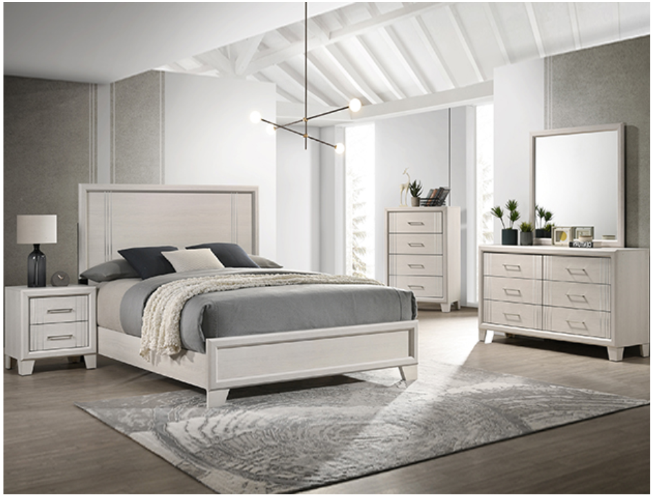 This elegant bedroom collection presents a sophisticated ensemble perfect for creating a refined modern aesthetic in your sleeping quarters. The suite features a sleek, minimalist design with crisp, clean lines and a lustrous white finish that exudes contemporary charm. Anchoring the set is a robust panel bed with a prominent headboard, promising a sturdy and stylish centerpiece. Flanking the bed are complementary case pieces, offering ample storage with their smooth-gliding drawers accented with chic silver-toned hardware.