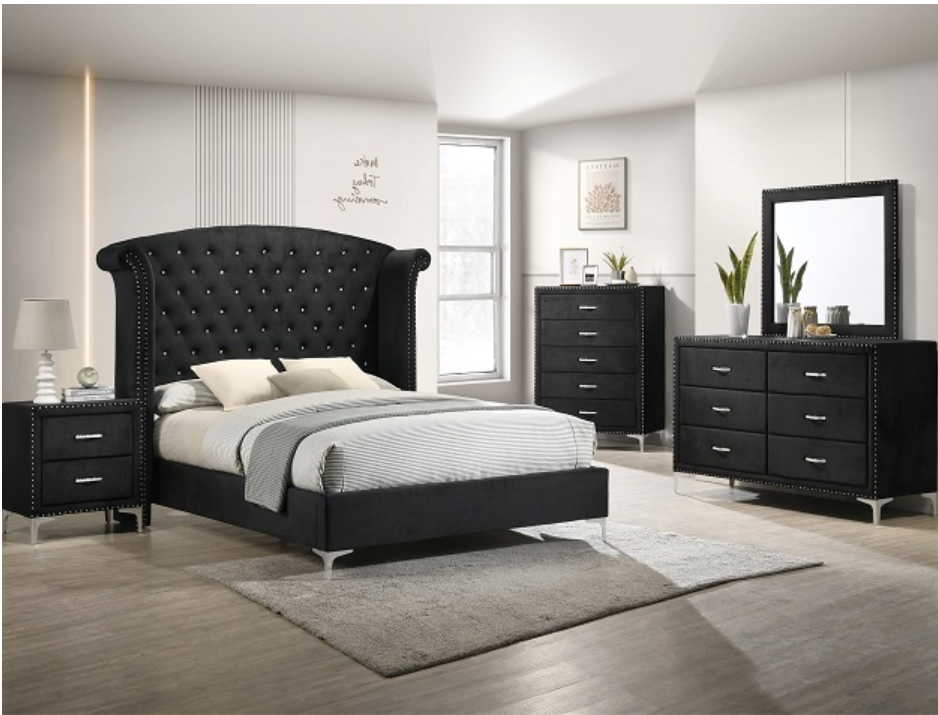 Immerse yourself in the regal charm of this majestic bedroom collection, a true embodiment of luxurious comfort and refined elegance. At the heart lies a bed that commands attention with its impressive wingback headboard, richly upholstered in a rich velvet and adorned with diamond tufting and shining nailhead trim, offering a sophisticated centerpiece. Accompanying the bed are matching pieces, each boasting the same sumptuous fabric and exquisite detailing. The nightstand and chest of drawers stand as stately companions, offering practical storage solutions without compromising on style, their sleek handles gleaming against the dark, plush fabric. The dresser, accompanied by a statement mirror framed with a hint of sparkle, completes the set, creating a harmonious balance between functional design and opulent aesthetics.