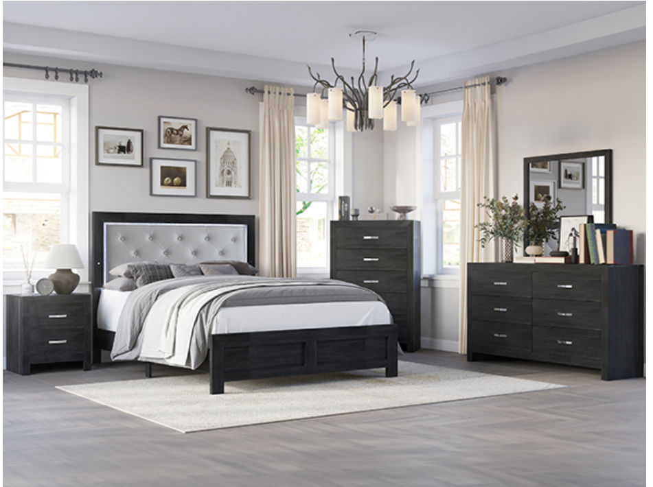 This bedroom suite offers a straightforward, modern design with a rich, dark finish that could seamlessly integrate into various decor styles. The set is pragmatic yet stylish, featuring clean lines and a simple, sturdy construction. The bed’s headboard is adorned with subtle tufting and integrated lighting, adding a touch of elegance without being overstated. Complementing the bed are the dresser and chest, both practical in size and functionality, with smooth, metallic handles for a contemporary touch. The nightstands provide convenience and coherence to the collection, ideal for keeping nighttime necessities close at hand.