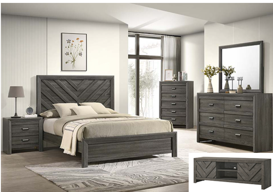 This bedroom collection encapsulates a blend of contemporary design and rustic charm. The centerpiece, a bed with a distinguished chevron patterned headboard, evokes a sense of craftsmanship and texture, infusing the space with character. Flanking the bed are matching pieces, each exhibiting clean lines and a weathered wood finish that suggests a lived-in elegance. The dresser, complemented by a substantial mirror, along with the tall chest, offer ample storage solutions with understated metal handles that enhance the modern farmhouse aesthetic. A nightstand completes the set, its compact design making it a practical addition to the suite.