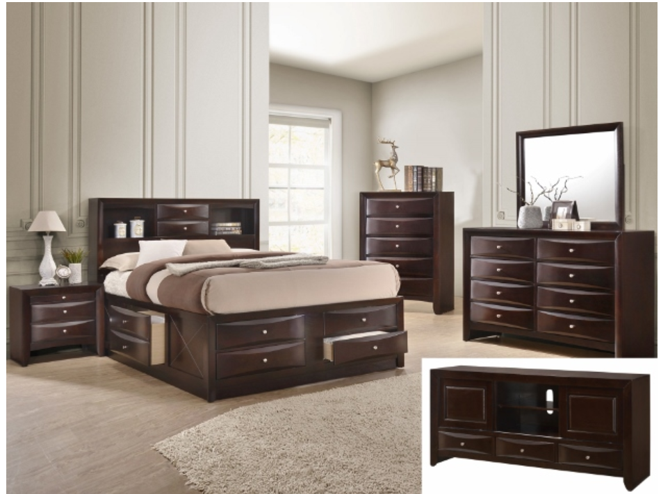 Experience timeless elegance with this sophisticated bedroom suite, exuding a rich cherry finish that enhances its robust and stately form. At the heart of the ensemble is a captain’s bed graced with an innovatively designed headboard, boasting integrated shelving and storage for both convenience and style. Accompanied by a harmoniously matching dresser with a mirror, a tall chest, and a nightstand, each piece is adorned with polished hardware that contrasts beautifully with the dark wood.