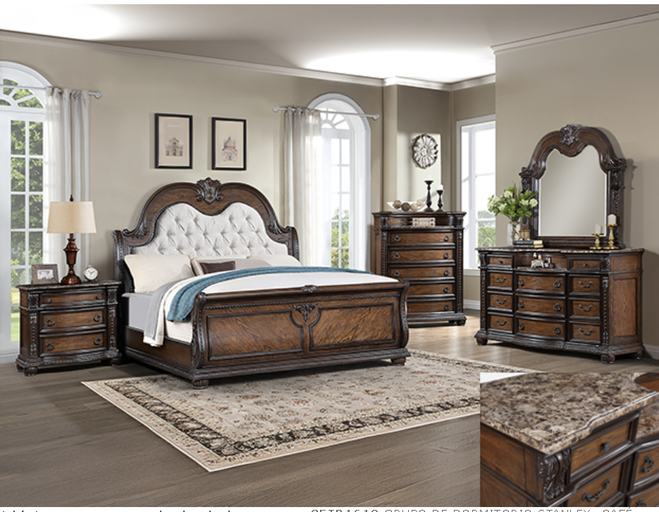 Step into a world where classic elegance meets timeless design with our exquisite bedroom collection. Designed for those who covet regal charm and functionality, this suite features rich, natural wood tones that evoke the grandeur of an aristocratic estate. Each piece boasts intricate carvings and moldings, with a stately bed that stands as the centerpiece — its tufted headboard provides a touch of luxury and comfort. The coordinating pieces, including a multi-drawer dresser, a gracefully curved mirror, and a tall chest, all offer generous storage while maintaining the sophisticated aesthetic. Marble tops and antiqued hardware add a final touch of elegance, ensuring this collection will elevate your bedroom into a luxurious retreat.