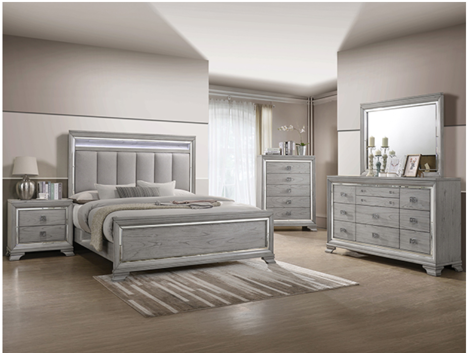 This elegant bedroom suite combines timeless design with contemporary appeal. The soft gray finish offers a modern twist on classic styling, with integrated LED lighting on the tufted headboard adding a luxurious focal point. The collection includes a bed, nightstands, a dresser, and a mirror, all featuring refined detailing and silver-toned hardware that exudes sophistication. Each piece showcases a distinct wood grain pattern, enhancing the suite’s upscale charm. The dresser and nightstand provide generous storage, with smooth-gliding drawers that cater to a seamless organization.