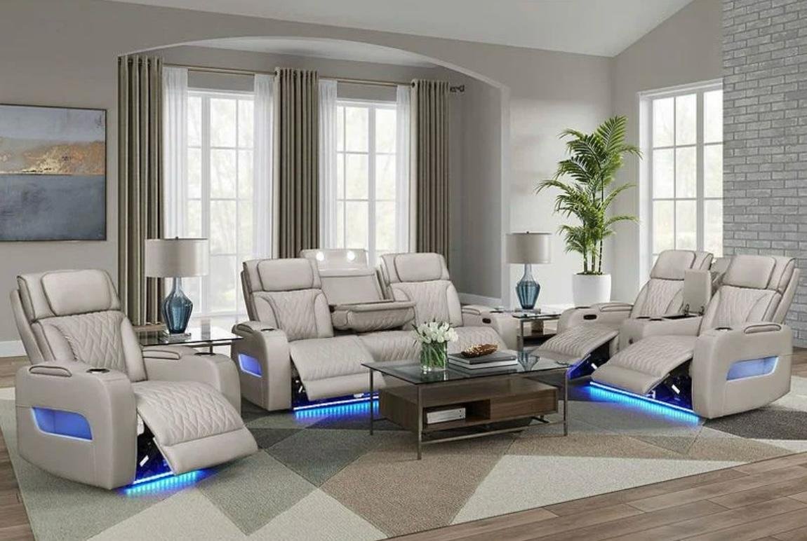 Luxury reclining living room set in beige faux leather with LED lighting, cup holders, and center console. Modern design with premium comfort for home theater living.